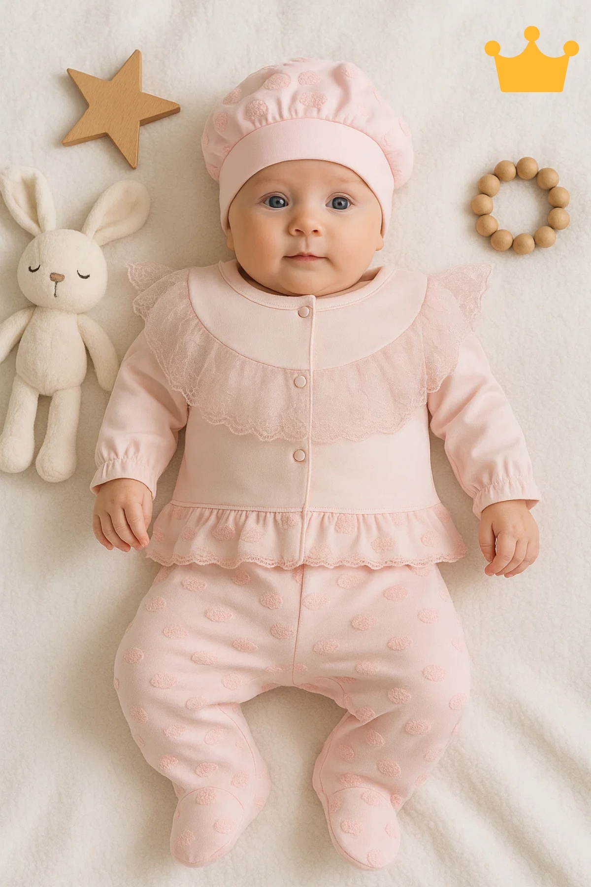 8 parçadan oluşan set, bebeklerin ilk günlerinden itibaren ihtiyaç duydukları konforu ve şıklığı sunar